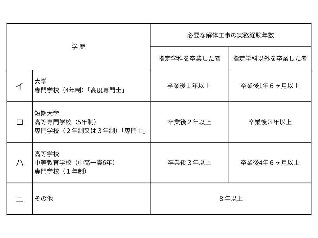 ※実務経験は解体工事に関するものに限ります。
