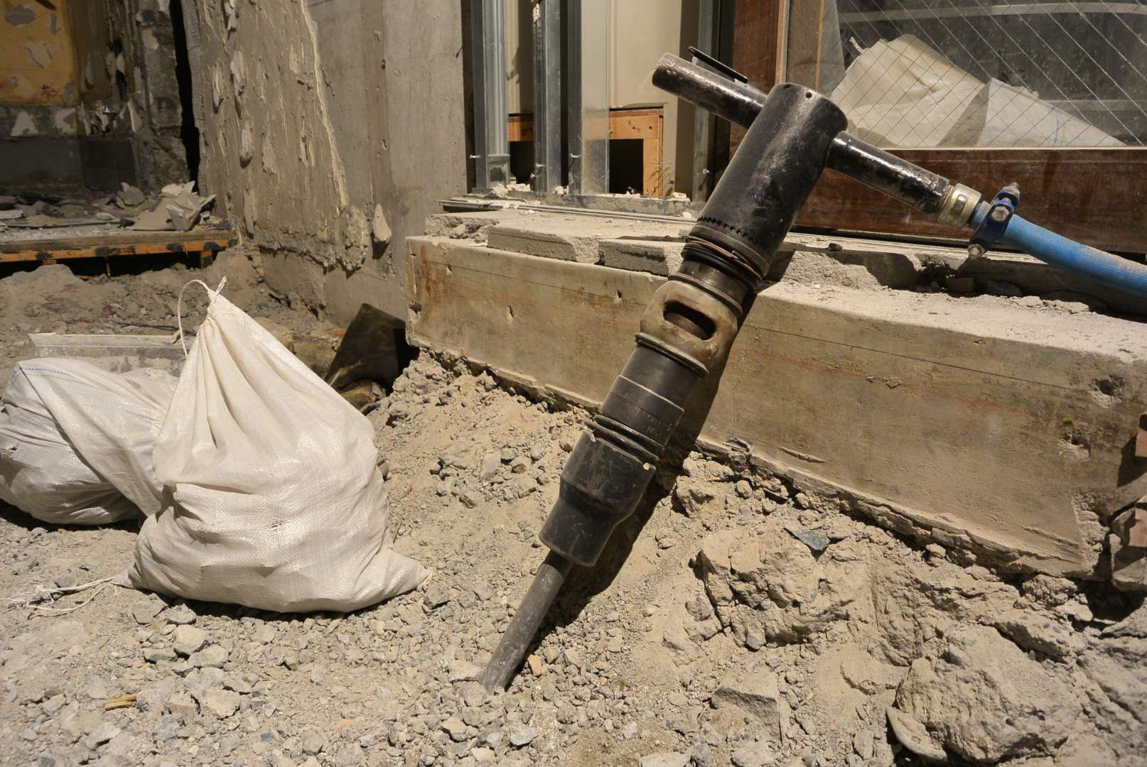 ブレーカー工法は、巨大なノミ(チゼル)のような器具を高速で打ち付け、コンクリートを「叩き割る」方法です。圧砕機のハサミが入らない狭い場所や、挟むだけでは壊せない硬い基礎部分、地中障害物の撤去に威力を発揮します。非常に破壊力が高い反面、作業中は大きな打撃音や振動が発生します。そのため、防音シートを隙間なく設置して粉塵の飛散を防ぐなど、近隣住民の方々への騒音対策と環境への十分な配慮が特に重要になります。