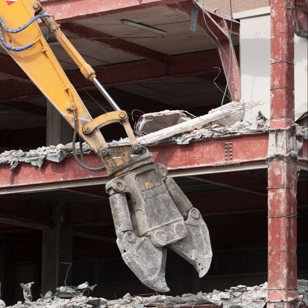 現場では通称「ハサミ」や「カニ」とも呼ばれる圧砕(あっさい)機です。巨大な爪でコンクリートの柱や壁を強力に挟み込んで破壊します。建物の骨組みを壊す「大割(おおわり)」と、地上でコンクリートを細かく砕いて内部の鉄筋を取り出す「小割(こわり)」があり、鉄筋コンクリート造の解体には欠かせない存在です。