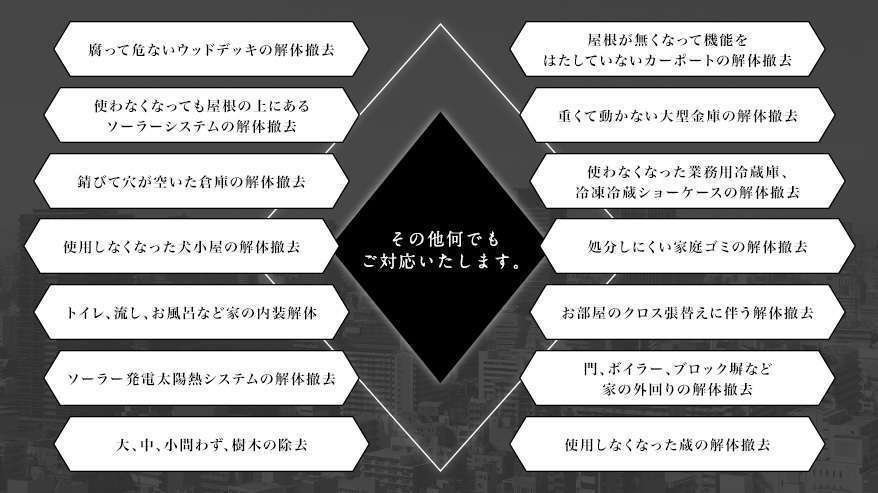 東京都小平市の株式会社シンセイでは、通常の木造解体などよりも小規模な解体工事も承っております。たとえばカーポートの上部だけ撤去、処分しにくい家庭ゴミの運搬、さらには犬小屋1つのみなど、規模の大小を問わずどんなことでもご相談ください。小さな工事であっても、常に丁寧・誠実な対応をお約束いたします。